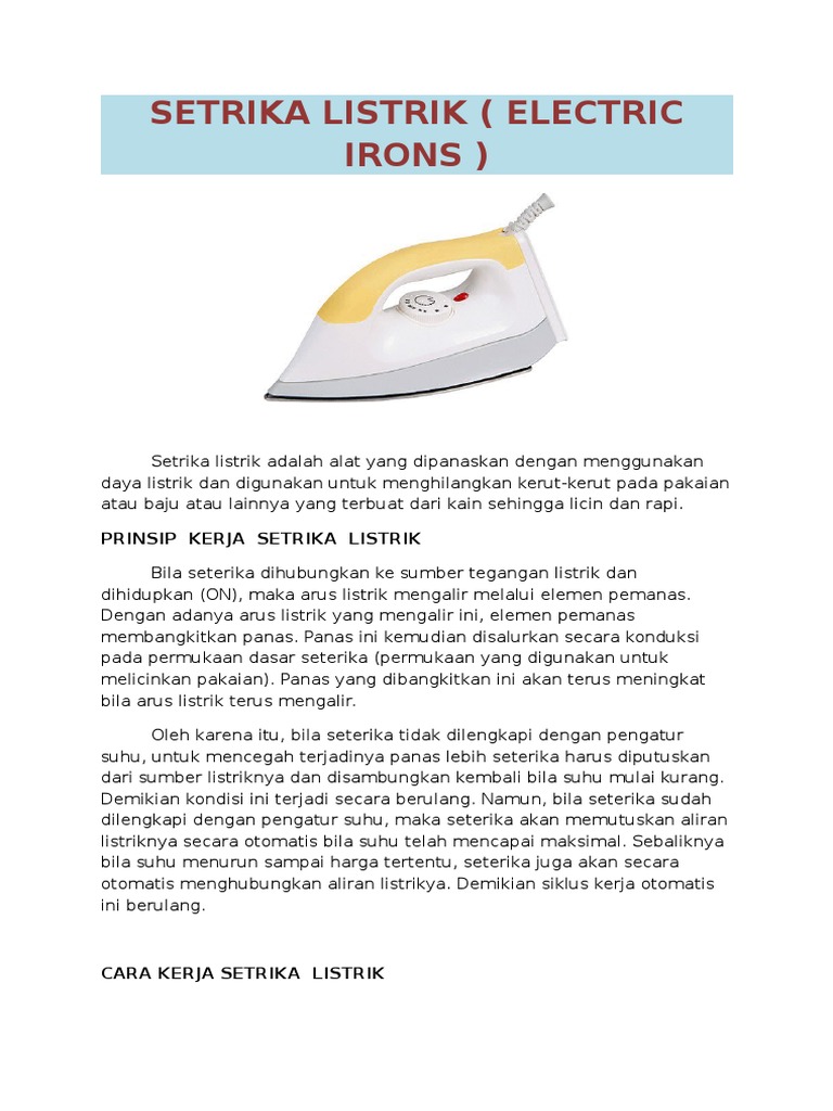 Panas tersebut dialirkan secara kondusi pada permukaan dasar setrika alas sterika. Cara kerja setrika listrik bila setrika listrik dihubungkan kesumber tegangan listrik dan dihidupkan on maka arus listrik mengalir melalui elemen pemanas heater sehingga timbulah panas dari elemen pamanas tersebut. Sedikit uraian tentang setrika listrik yang akan dijelaskan di sini mungkin dapat membantu memberikan gambaran sehingga mempermudah bagi mereka yang mau mencoba untuk belajar memperbaiki setrika listrik. Berikut adalah jenis jenis setrika listrik yang digolongkan dalam peralatan.