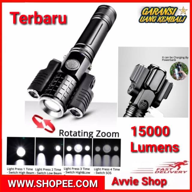 Taffled senter led rotating zoom cree xm l t6 2 x xpe 15000 lumens. Terdapat 4 mode senter yaitu 1 light on 2 lights on 3 lights on 3 lights strobe.