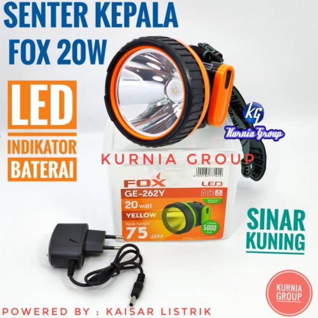 Senter kepala cahaya warna kuning 20 watt.